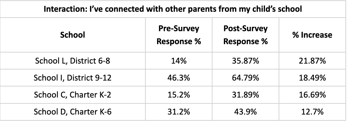 Specifically, on survey results:There was an average increase of 10.4% in families reporting they’ve attended a school event. Here’s more on the school-specific data: